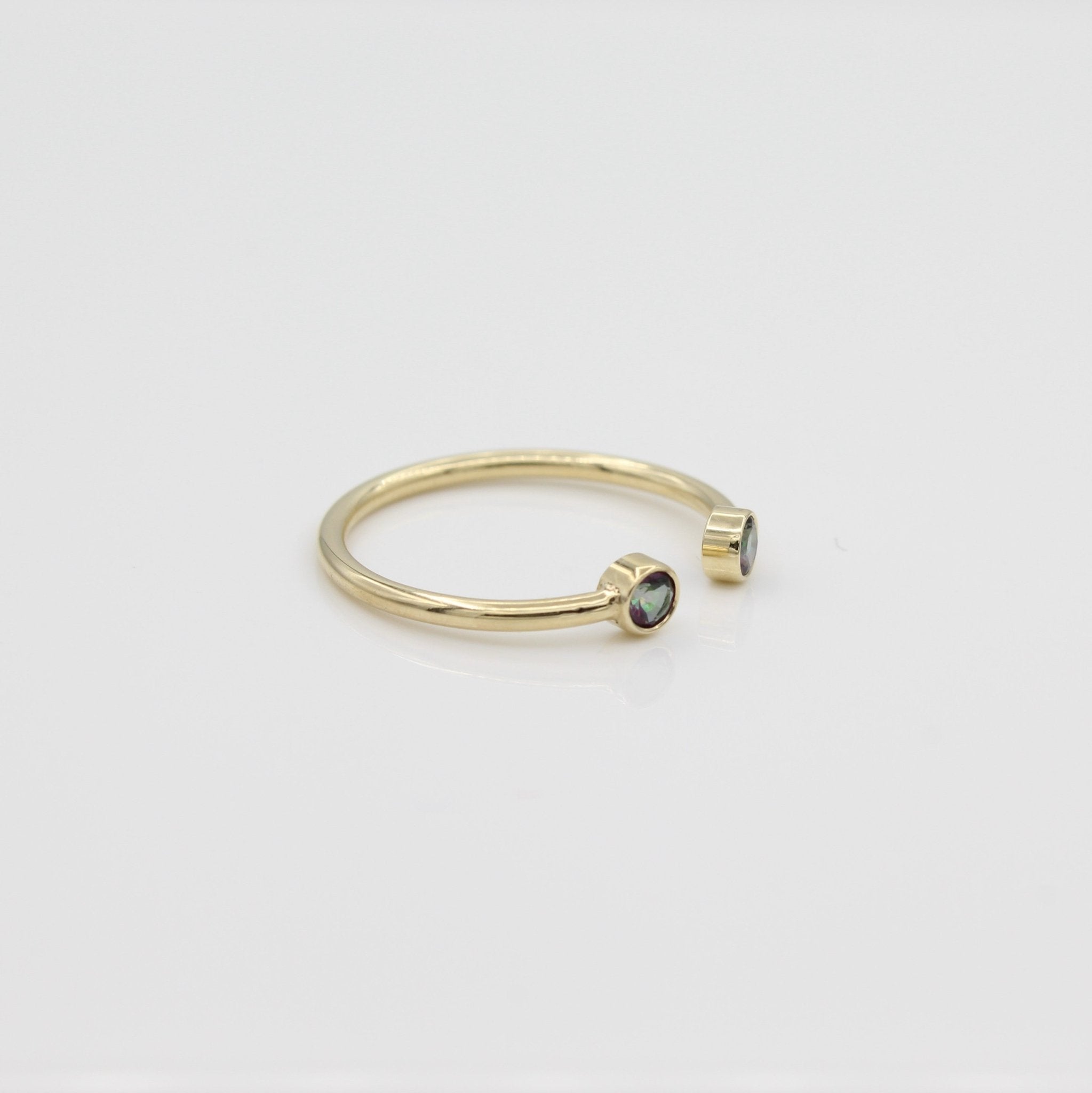 Full of vibrant personality, mystic topaz is fun and funky, changing colors at every angle. Predominantly green and purple, mystic topaz showcases every color of the rainbow, and our open ring features two stones for twice the fun.