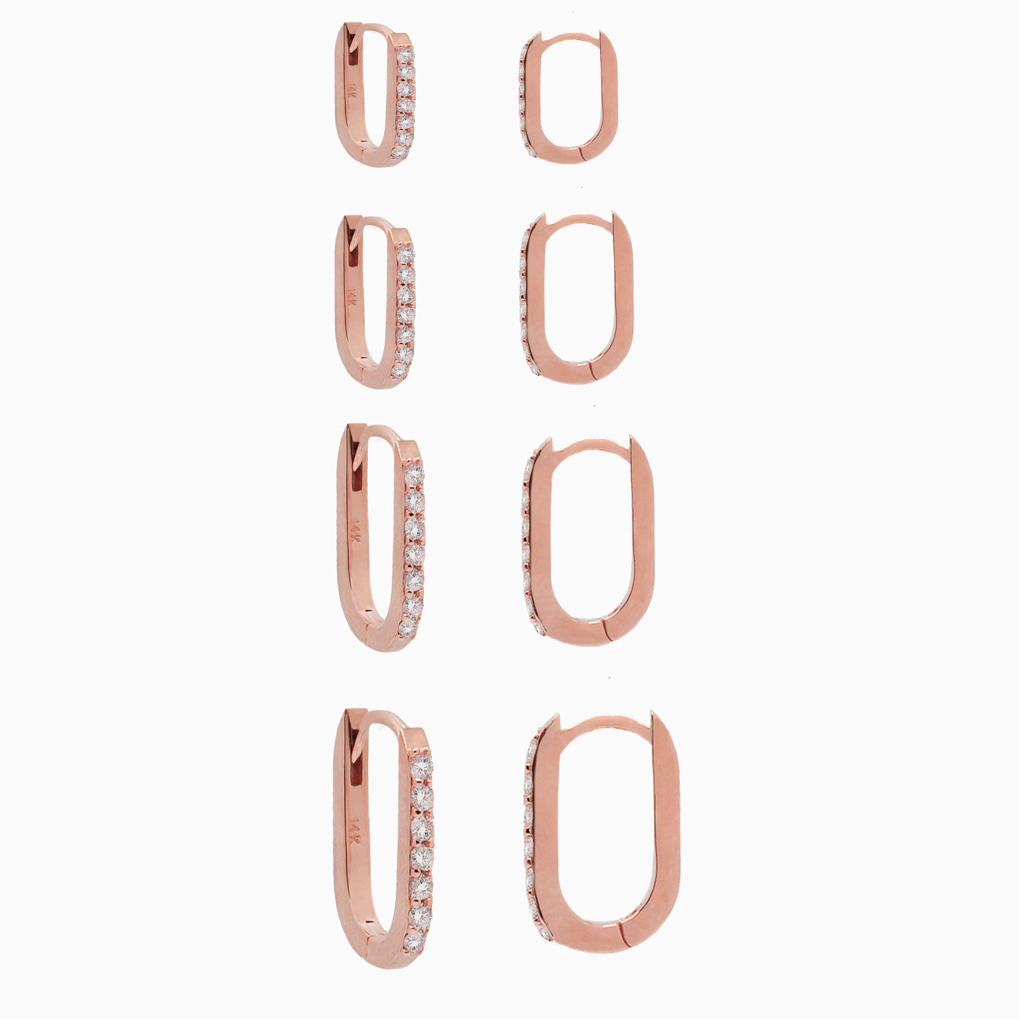 Constructed of sturdy 14k gold, these earrings are available in yellow, white, or rose gold. Each earring measures 13mm x 9mm, are 1.5mm wide, and feature a total of fourteen 1.2mm natural diamonds per pair, with approximately 0.17ct natural diamonds per pair. Our Diamond Paperclip Hoops are hinged.