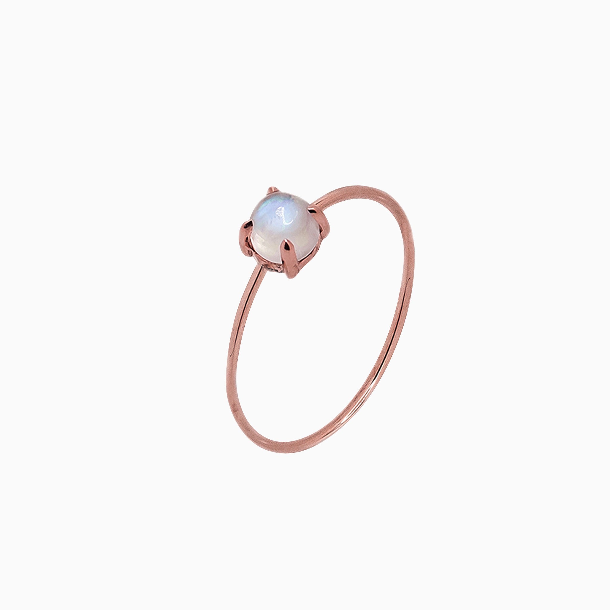 A sturdy microstackable 14k gold ring with a delicate look, handmade in New York with a 3mm Mystical Moonstone stone in a 4-prong setting on a 0.91mm band. Available in yellow, rose, or white gold. Colors of natural materials vary slightly, and the color of products may appear different on different screens. Each stone is selected for its beauty.