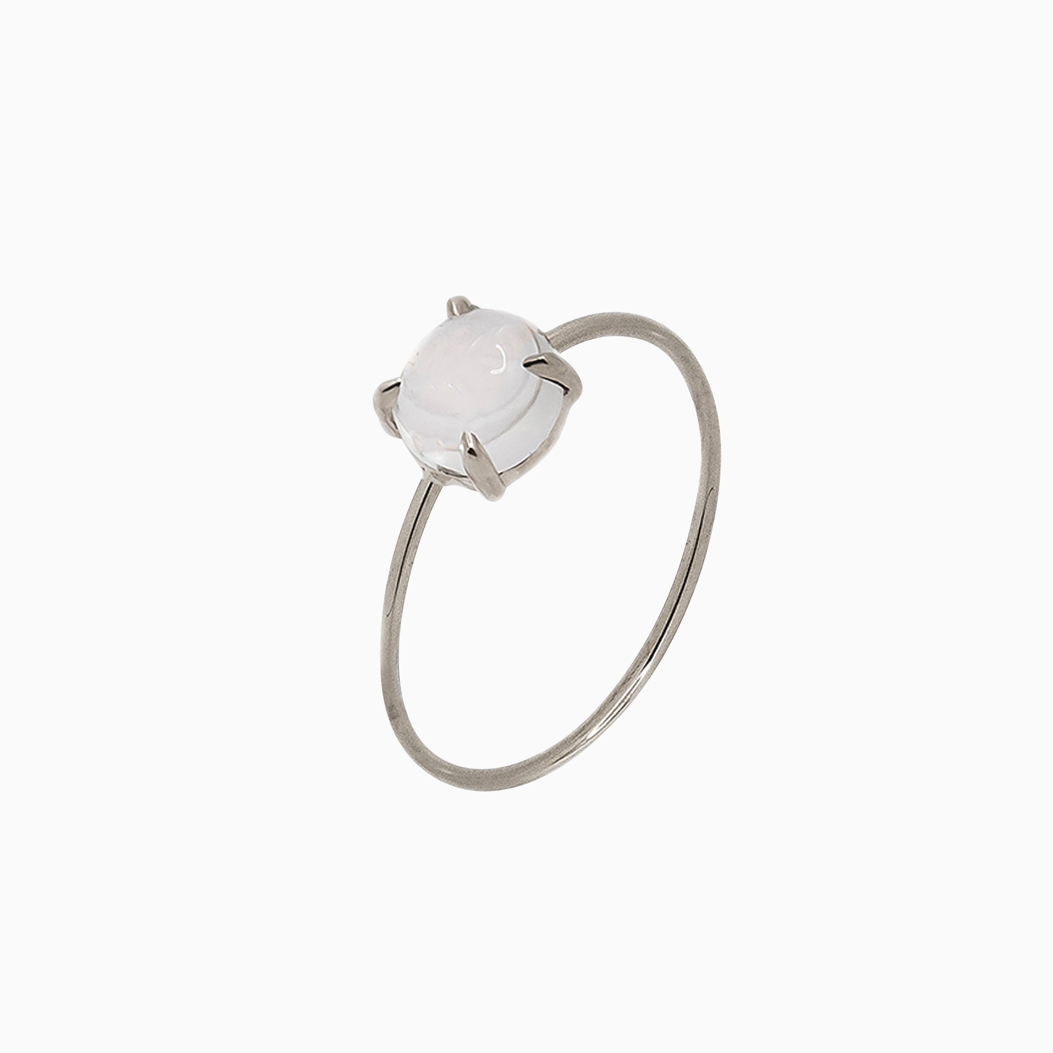 The cabochon-cut white quartz measures approximately 3mm, 4mm, 5mm, and 6mm. Stone size is approximate, and all colored stone rings will be within a 0.2mm tolerance of their statement measurement. All of our colored stones are picked for their beauty, and there is some natural variation.