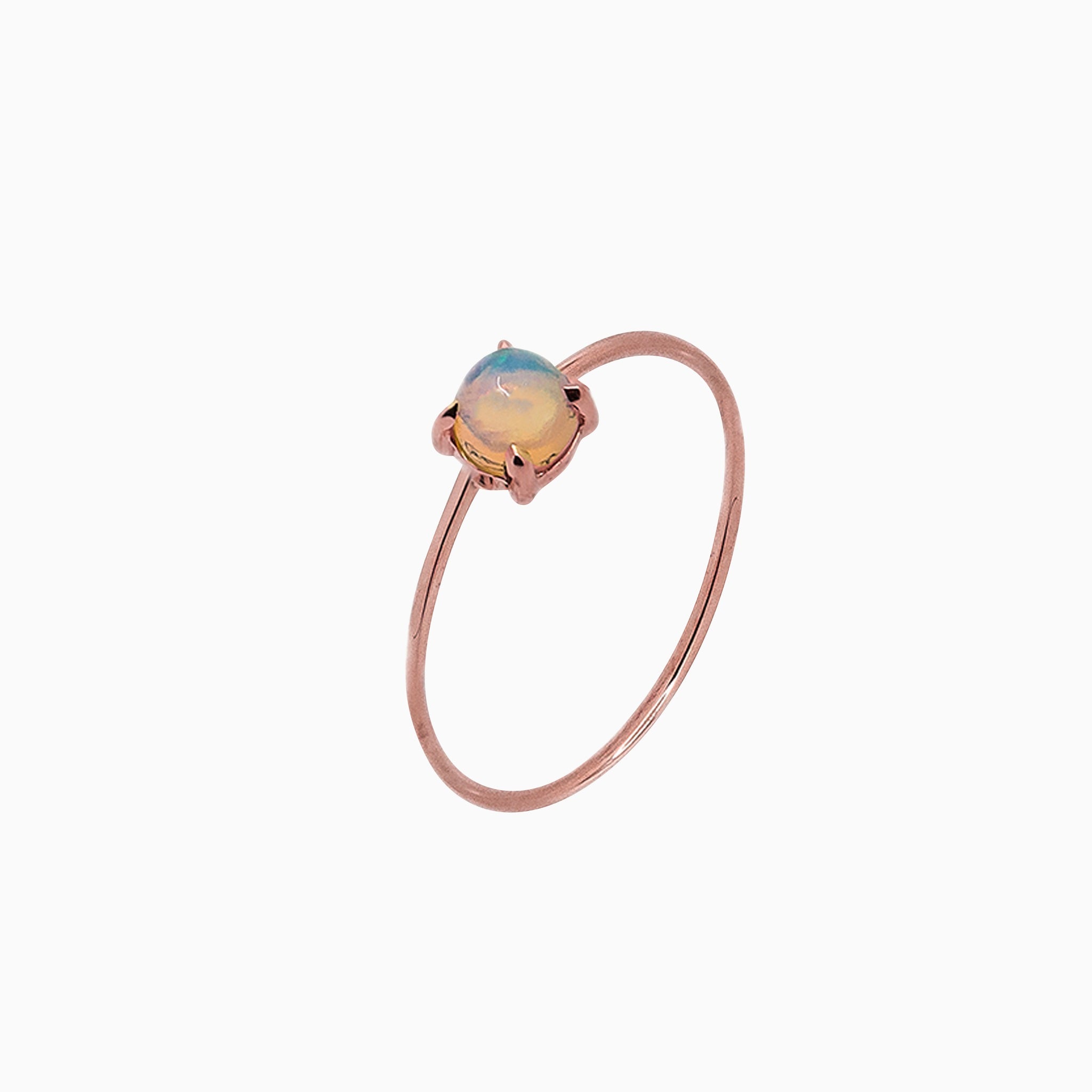 Our Microstackables Collection is constructed of sturdy 14k gold, and is available in yellow, white, or rose gold. Our Mysterious Opal Microstackable Ring features a 3mm cabachon-cut opal set in a 4-Prong Claw Setting situated on a delicate-but-sturdy 0.91mm solid gold band.