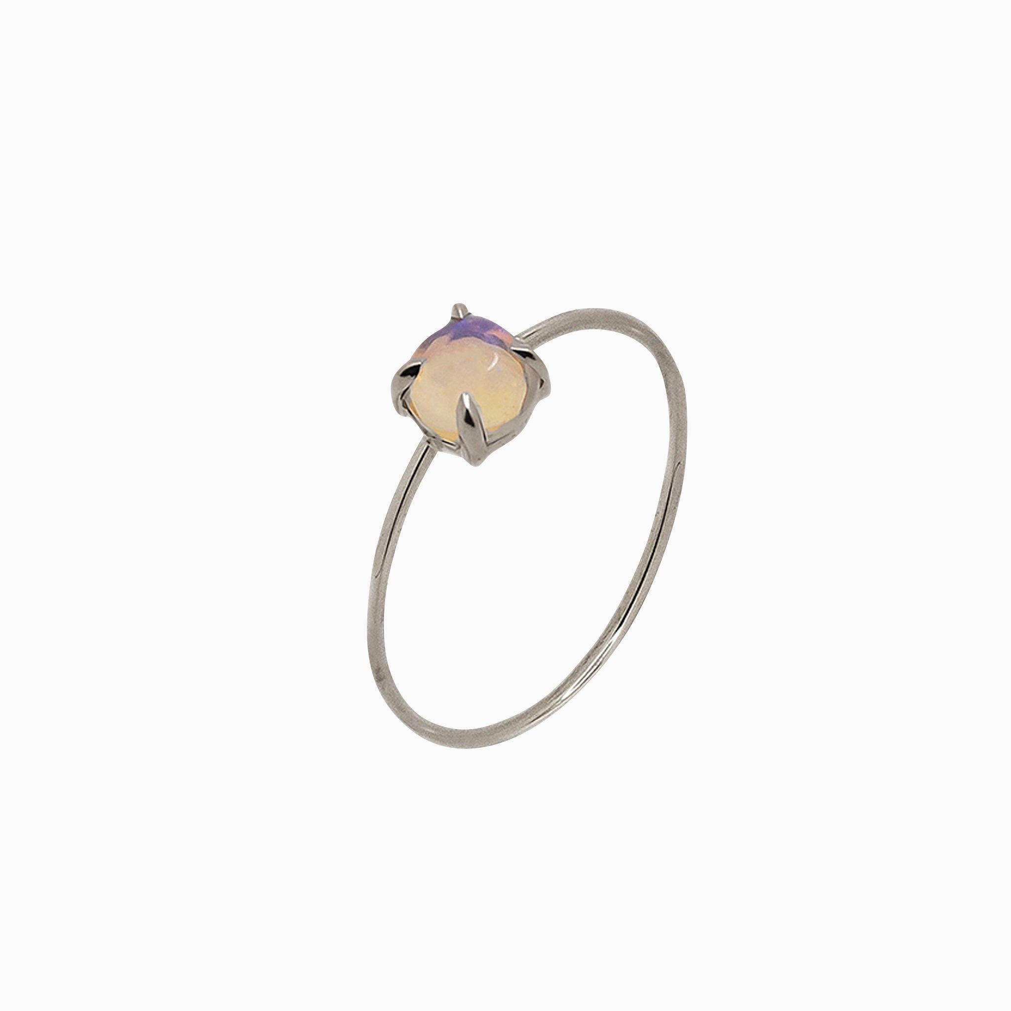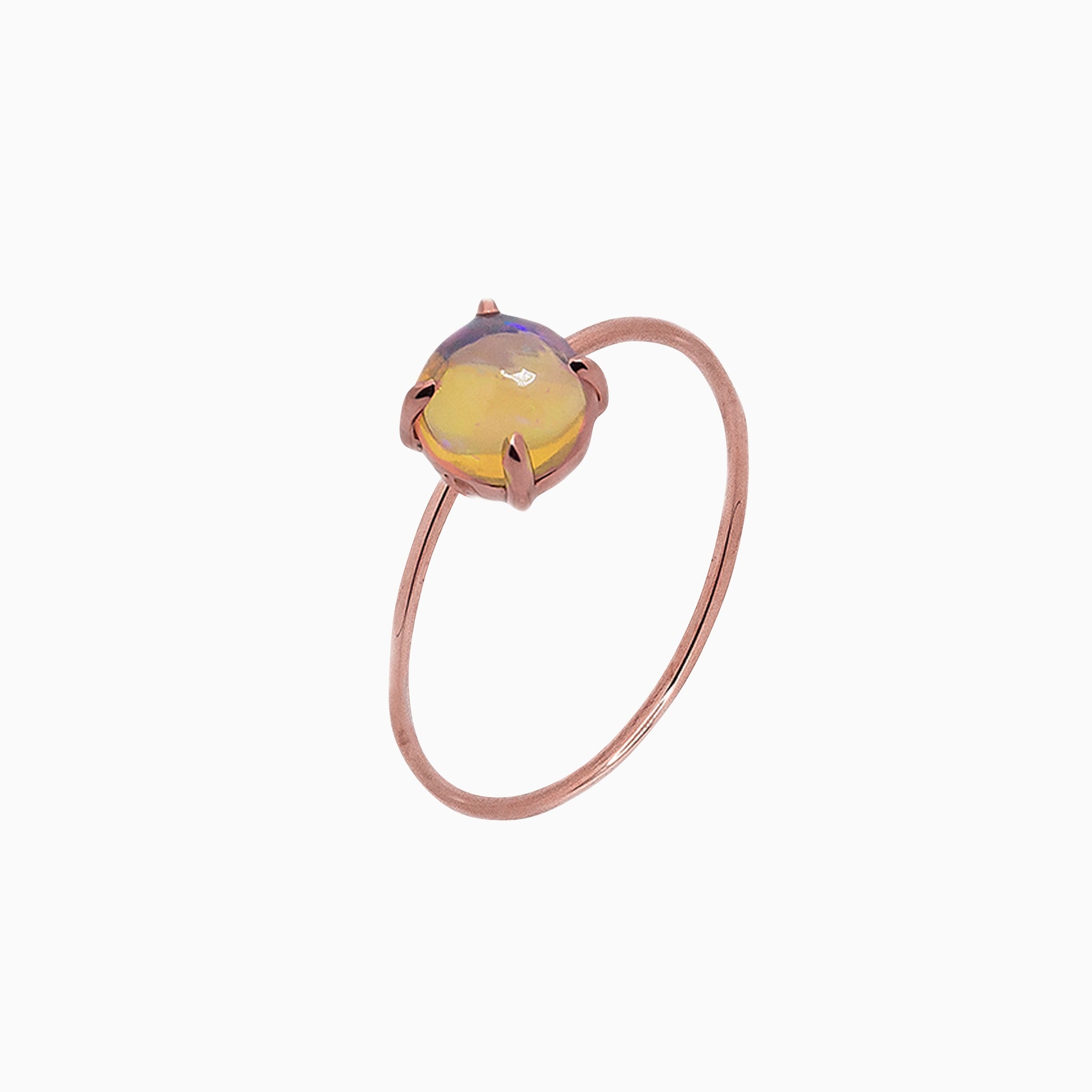 A sturdy microstackable 14k gold ring with a delicate look, handmade in New York with a 3mm Mysterious Opal stone in a 4-prong setting on a 0.91mm band. Available in yellow, rose, or white gold. Colors of natural materials vary slightly, and the color of products may appear different on different screens. Each stone is selected for its beauty.