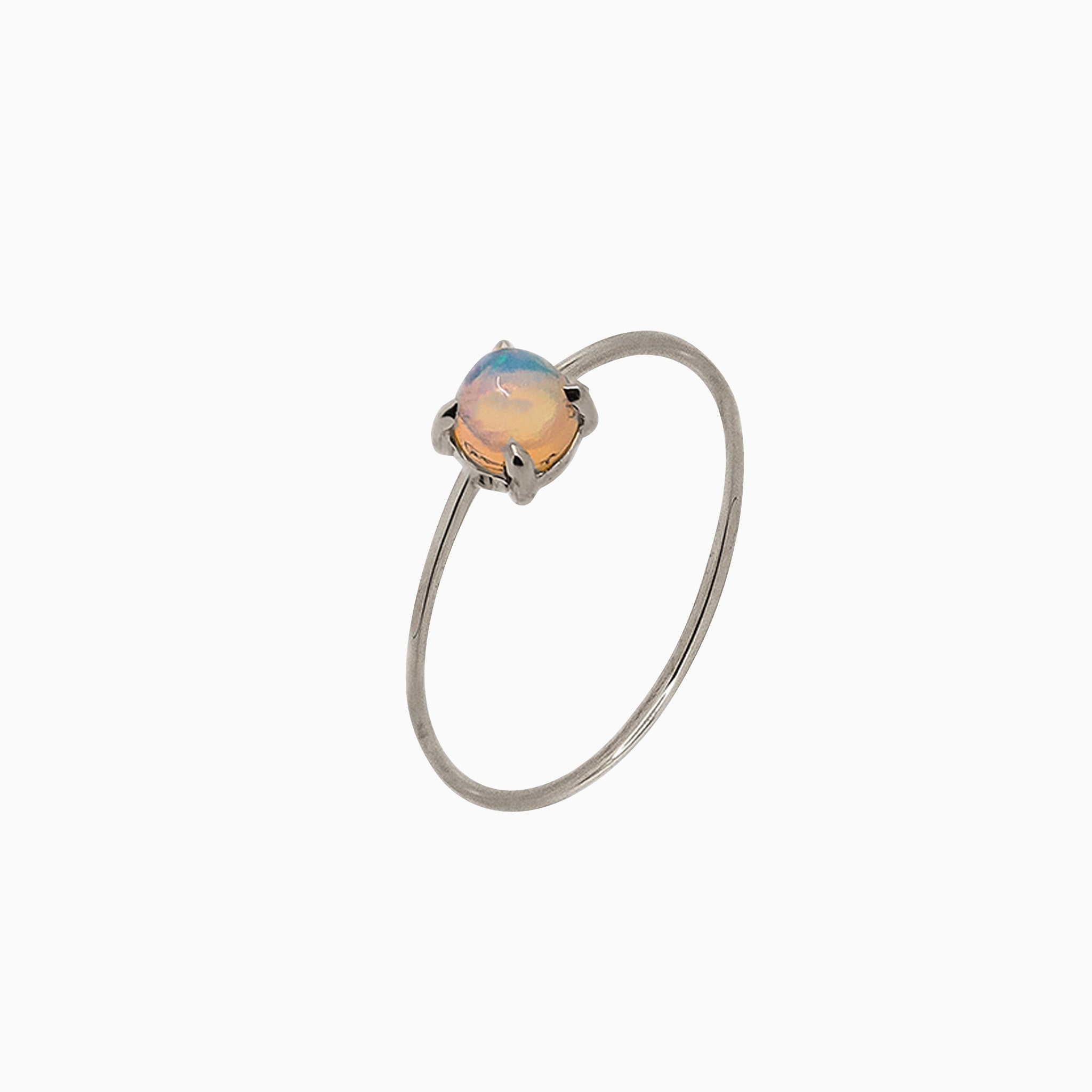 The cabochon-cut opal measures approximately 3mm, 4mm, 5mm, and 6mm. Stone size is approximate, and all colored stone rings will be within a 0.2mm tolerance of their statement measurement. All of our colored stones are picked for their beauty, and there is some natural variation.